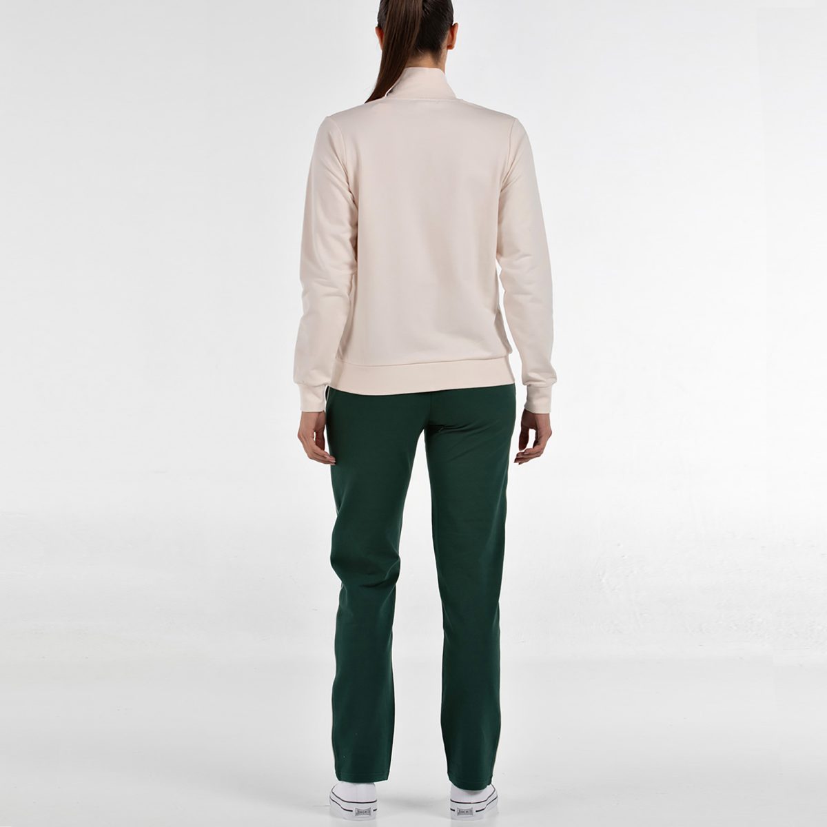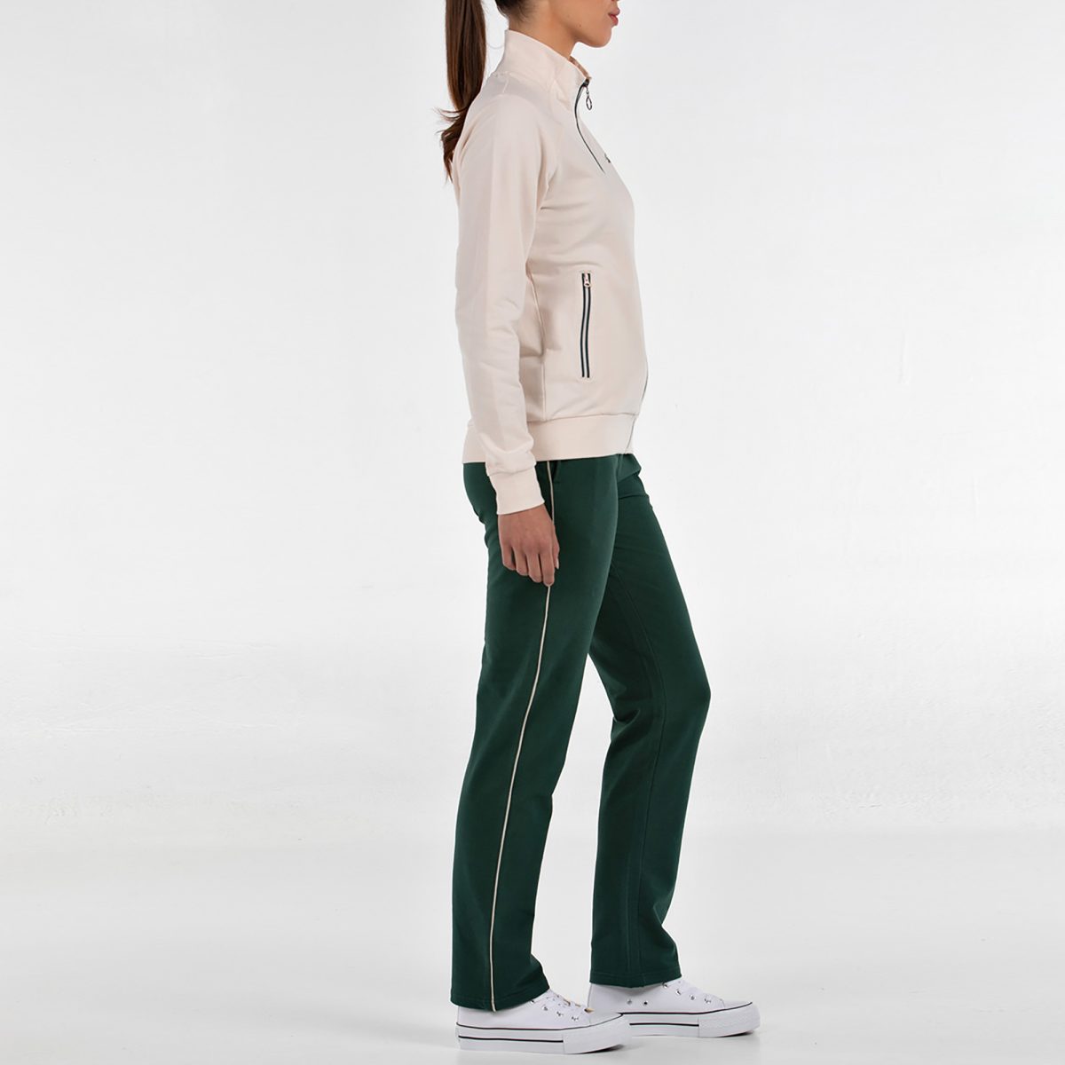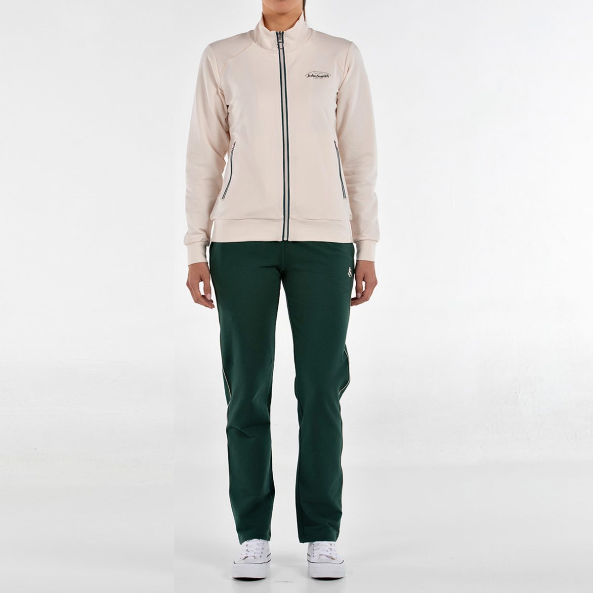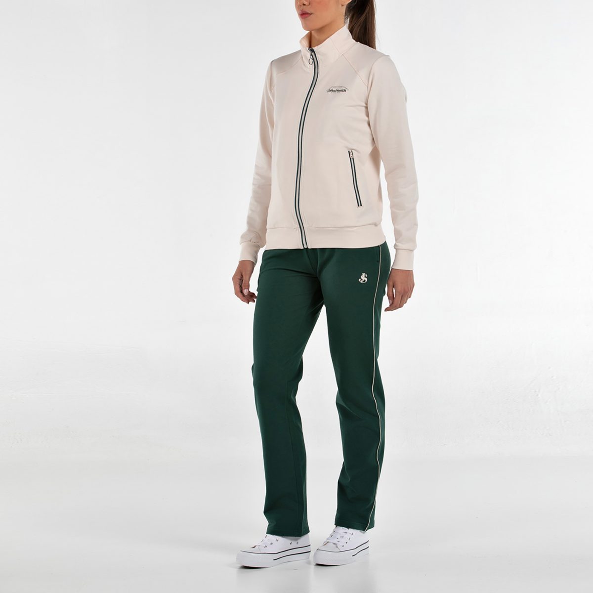 Este chándal de mujer está diseñado para combinar comodidad, estilo y versatilidad en un solo conjunto. Se compone de una chaqueta abierta con cremallera central, cuello, puños y bajo en rib, y bolsillos laterales con cremallera, decorados con vivos a contraste que aportan un toque moderno y deportivo. El pantalón de bajo recto incorpora cinturilla elástica en rib con cordón ajustable, bolsillos laterales y un bies a contraste en forma de banda, que estiliza la silueta y completa el diseño con un acabado actual. Todo el conjunto está confeccionado en punto elástico de algodón, un tejido suave y cómodo, y se remata con gráficos en alta densidad que refuerzan su carácter y personalidad. Un chándal cómodo, estiloso y fácil de llevar: perfecto para el día a día, para entrenar o para lucir un look deportivo con estilo propio.