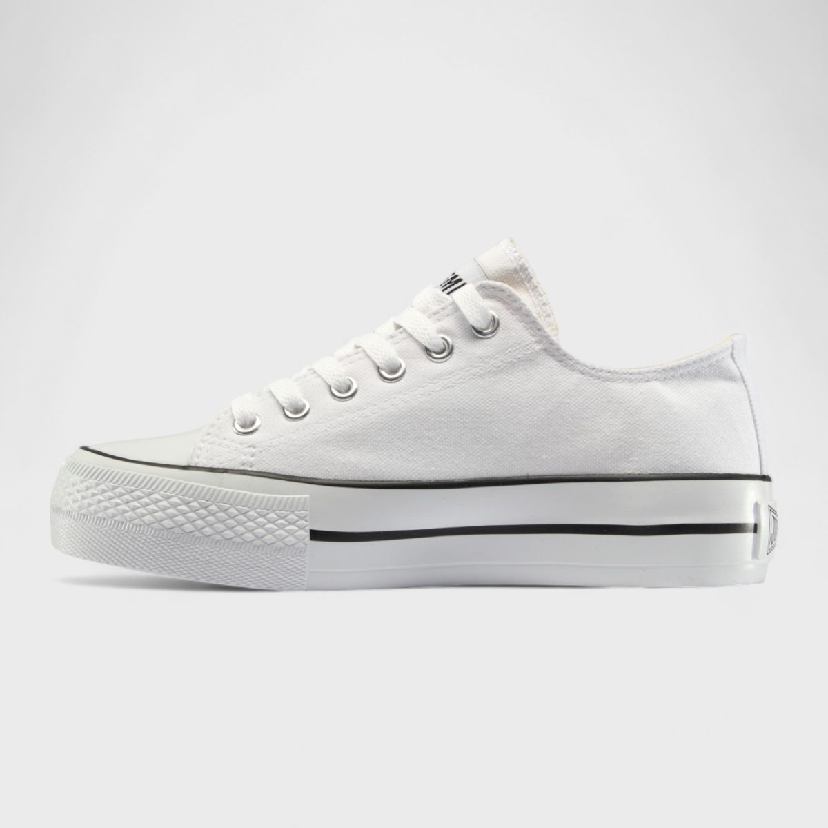 Zapatilla de perfil bajo, destaca su suela vulcanizada más alta de lo normal, siguiendo la tendencia del mercado. La suela cuenta con un patín de goma con diseño de tacos romboidales, que compatibiliza estar la moda con la utilidad de la misma, dándonos unas cualidades de suela muy buenas para una zapatilla casual. Su corte es de lona, especialmente apropiado para las temporadas de primavera y verano. Lleva plantilla con cuña adicional.