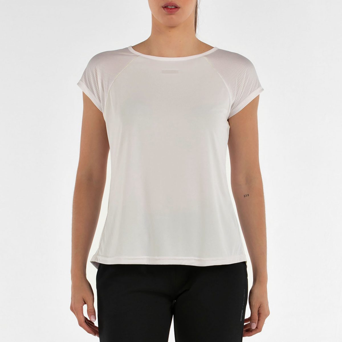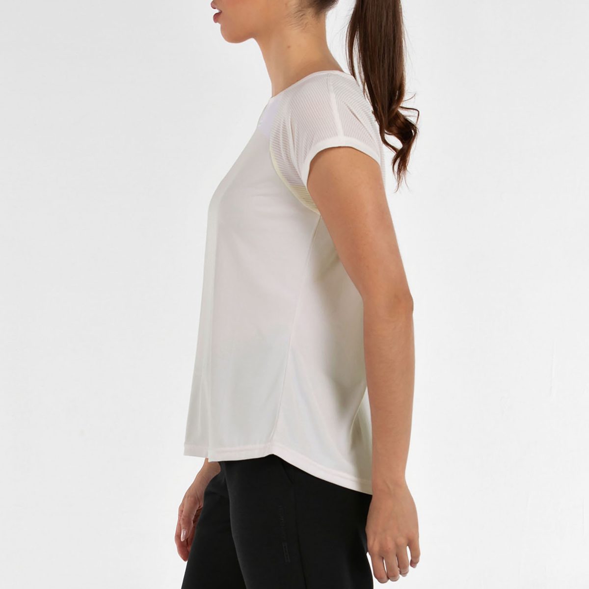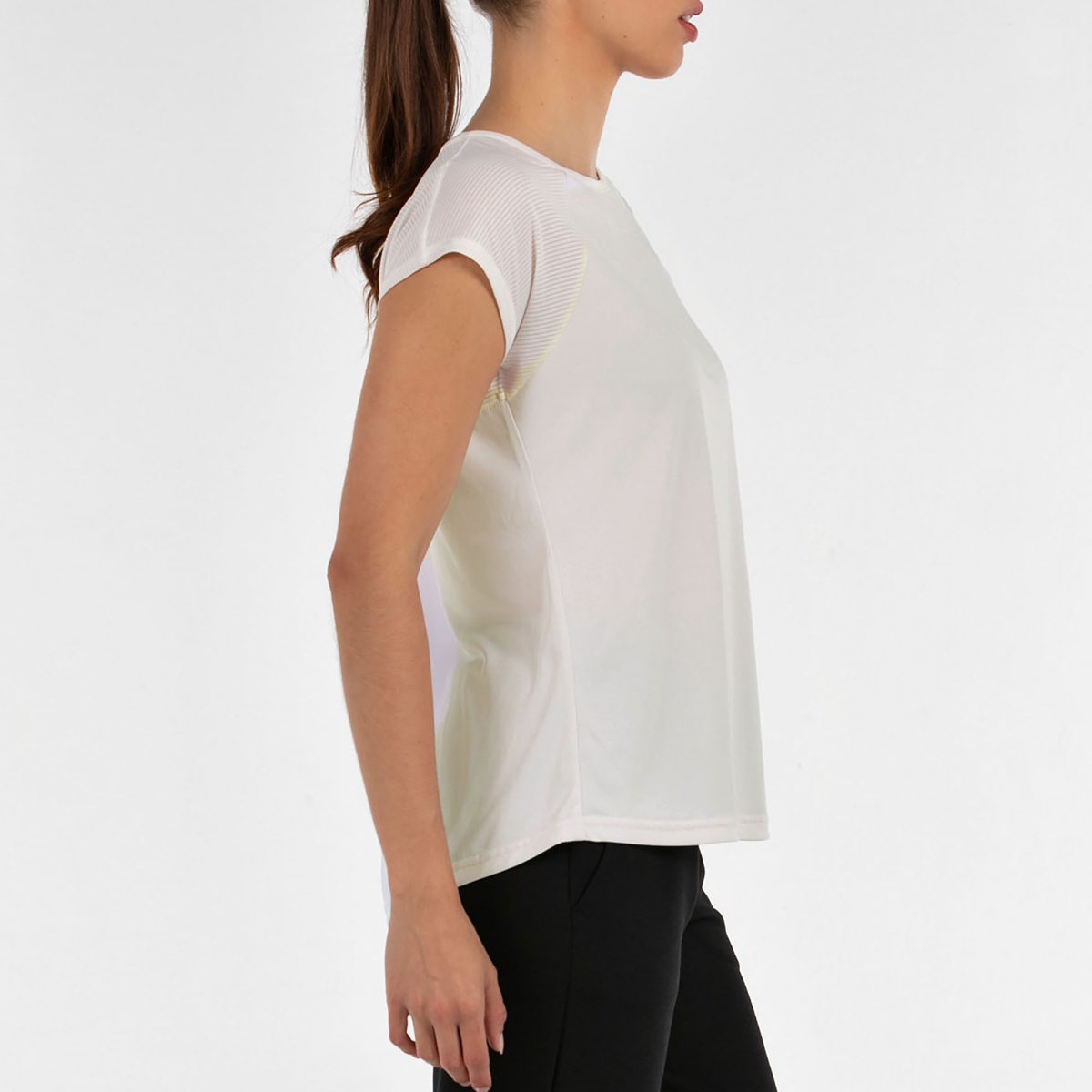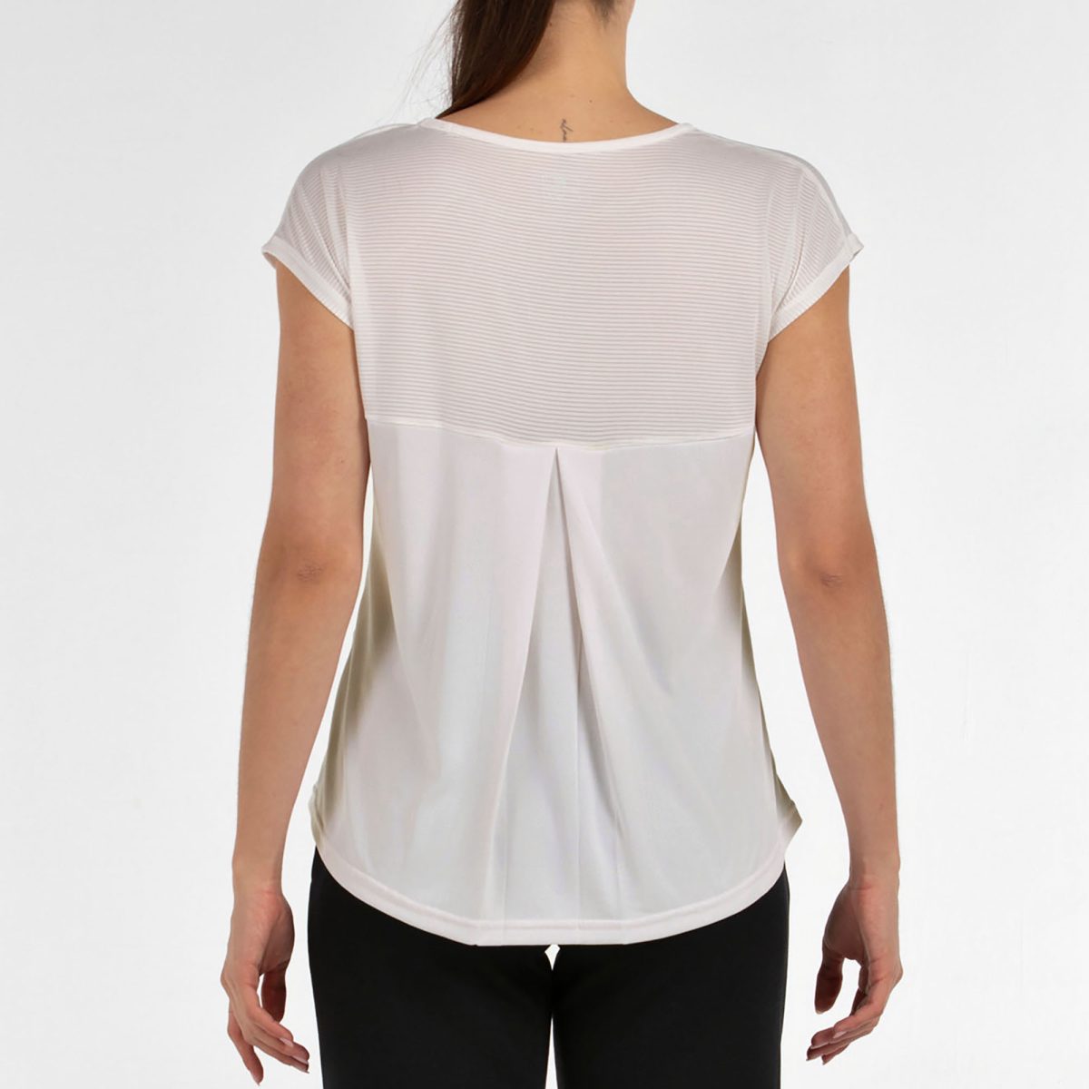 Esta camiseta destaca por su escote abierto y un pliegue en la espalda que aporta caída, movimiento y un toque femenino muy favorecedor. Su diseño ligero y actual la convierte en una prenda cómoda y estilosa para cualquier momento del día. Está confeccionada en poliéster ligero, e incorpora inserciones de tejido texturizado con rayas que añaden dinamismo y un acabado diferenciado al conjunto. Una camiseta versátil, fresca y con estilo propio: ideal para entrenar, moverte con libertad o completar un look casual deportivo con un aire sofisticado.
